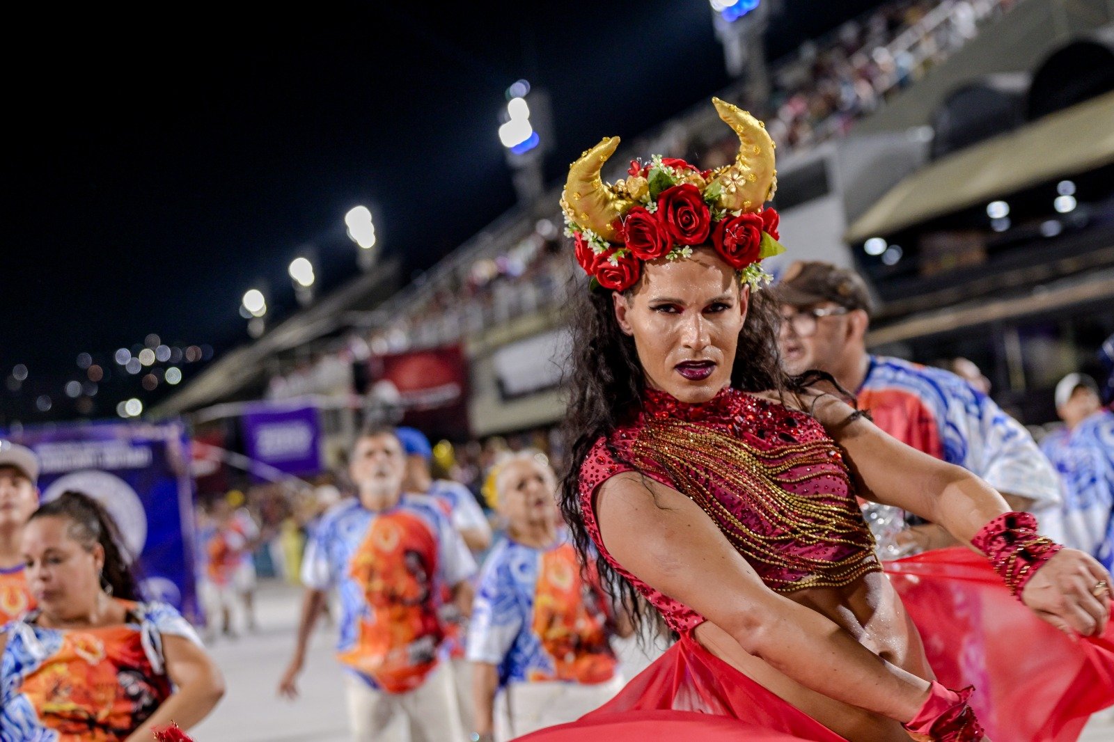 E para entrar bem no personagem, a caracterização contou com lentes brancas durante a sua passagem na Marquês de Sapucaí. Gato chega com tudo no pré-carnaval e já promete ousar ainda mais no desfile oficial da agremiação. A beldade luta pela representatividade no carnaval ao apresentar em cima de um salto alto e com fantasias tradicionalmente associadas ao corpo feminino.